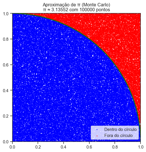 # 1) Imports e sementeimport timeimport randomimport matplotlib.pyplot as pltfrom matplotlib.patches import Arcrandom.seed(123)# 2) Função de aproximação de π (Python puro)def aproximar_pi_calculo_py(num_pontos): dentro =0for _ inrange(num_pontos): x = random.uniform(0, 1) y = random.uniform(0, 1)if x*x + y*y <=1: dentro +=1return4* dentro / num_pontos# 3) Função de visualização (Monte Carlo)def visualizar_aproximacao(num_pontos_plot): dentro_x, dentro_y = [], [] fora_x, fora_y = [], []for _ inrange(num_pontos_plot): x, y = random.uniform(0, 1), random.uniform(0, 1)if x*x + y*y <=1: dentro_x.append(x) dentro_y.append(y)else: fora_x.append(x) fora_y.append(y) pi_grafico =4*len(dentro_x) / num_pontos_plot fig, ax = plt.subplots(figsize=(6,6)) ax.scatter(dentro_x, dentro_y, color='blue', s=1, label='Dentro do círculo') ax.scatter(fora_x, fora_y, color='red', s=1, label='Fora do círculo') circ = Arc((0, 0), 2, 2, theta1=0, theta2=90, color='green', linewidth=2) ax.add_patch(circ) ax.set_aspect('equal') ax.set_xlim(0,1) ax.set_ylim(0,1) ax.legend(loc="lower right") plt.title(f'Aproximação de π (Monte Carlo)\nπ ≈ {pi_grafico:.5f} com {num_pontos_plot} pontos') plt.show()# 4) Execução e medição de temposif__name__=="__main__": N =100_000# chamando função t0 = time.time() pi1 = aproximar_pi_calculo_py(N) t1 = time.time()print(f"[Python puro] π ≈ {pi1:.5f} tempo: {t1-t0:.4f} segundos")# Visualização dos pontos visualizar_aproximacao(N)