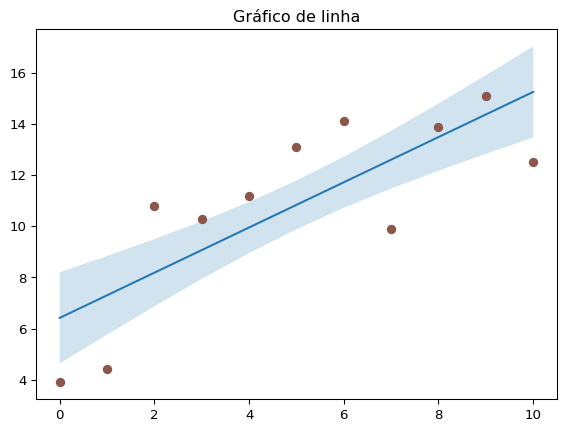 import matplotlib.pyplot as pltimport numpy as npN =21x = np.linspace(0, 10, 11)y = [3.9, 4.4, 10.8, 10.3, 11.2, 13.1, 14.1, 9.9, 13.9, 15.1, 12.5]# fit a linear curve and estimate its y-values and their error.a, b = np.polyfit(x, y, deg=1)y_est = a * x + by_err = x.std() * np.sqrt(1/len(x) + (x - x.mean())**2/ np.sum((x - x.mean())**2))fig, ax = plt.subplots()ax.plot(x, y_est, '-')ax.fill_between(x, y_est - y_err, y_est + y_err, alpha=0.2)ax.set_title('Gráfico de linha')ax.plot(x, y, 'o', color='tab:brown')