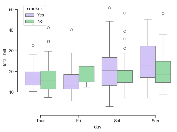 import seaborn as snssns.set_theme(style="ticks", palette="pastel")# Load the example tips datasettips = sns.load_dataset("tips")# Draw a nested boxplot to show bills by day and timesns.boxplot(x="day", y="total_bill", hue="smoker", palette=["m", "g"], data=tips)sns.despine(offset=10, trim=True)